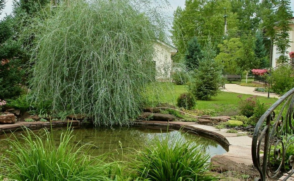 Ранее мы говорили, что размещать деревья прямо возле водоёма — не лучшая идея, так как в него будут постоянно попадать опавшие листья. Но если вас не смущает регулярно убирать с поверхности пруда листву или у вас установлен хороший скиммер, тогда в качестве деревьев у воды лучше всего смотрятся ивы, особенно невысокие и плакучие формы. Они красиво отражаются в воде и создают лёгкую тень.